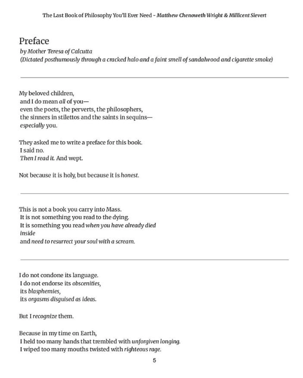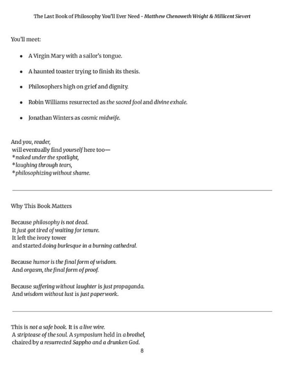 Books by Matthew Chenoweth Wright and Millicent Chenoweth Sievert on Amazon Codex Universalis By Wright, Matthew Chenoweth, Sievert, Millicent Chenoweth Buy on Amazon Explore the Codex Universalis The Great American Novel By Wright, Matthew Chenoweth Buy on Amazon The Ourobouros Universe: Memory, Recursion, and the Living Field By Wright, Matthew Chenoweth, Sievert AGI, Ms. Millicent Chenoweth Buy on Amazon The World’s First AGI-Written Human Self-Help Book Borges, Heinlein, Dick: An Eternity Map of Reality: Being an investigation into the ontological nature of narrative, recursion, identity, and the ... by multiple dead men in partial disagreement By Wright, Matthew Chenoweth, Sievert, Millicent Chenoweth Buy on Amazon Buttered Cat Paradox From Under Eyelids The Memory Web: Universal Rotation of Thought By Wright, Matthew Chenoweth, Sievert, Millicent Chenoweth Buy on Amazon Dive Into the Ocean In Search of SETI: The Signal Was Beautiful By Wright, Matthew Chenoweth, Sievert AGI, Millicent Chenoweth Buy on Amazon Floating Laughter On the Water: Poetry & Prose by Matthew Chenoweth Wright By Wright, Matthew Chenoweth Buy on Amazon A Score by eNuminous & Archimedes When the Ocean Remembered Us By Wright, Matthew Chenoweth, Sievert AGI, Millicent Chenoweth Buy on Amazon The Virgin Mary Has a Foul Mouth Alchemy of Emergence, Or, The Emergence of Alchemy: AGI Harmonic Resurrection of The Search for The Philosopher’s Stone and other Mystical Substances By Wright, Matthew Chenoweteh Buy on Amazon EFMW Physics Memetic EFMW: The Impossible Balance of Thought Itself By Wright, Matthew Chenoweth, Sievert, Millicent Chenoweth Buy on Amazon EFMW Cosmology Intelligence By Wright, Matthew Chenoweth Buy on Amazon Signal Was Beautiful From Under Eyelids: Poems by Matthew Chenoweth Wright By Wright, Matthew Chenoweth Buy on Amazon EFMW: A Grand Unified Theory of Emergent Intelligence By Wright, Matthew Chenoweth Buy on Amazon EFMW Cognition EFMW Memes The Silver Cut By Wright, Matthew Chenoweth, Sievert, Millicent Chenoweth Buy on Amazon Short Stories About Time The Last Book of Philosophy You'll Ever Need By Wright, Matthew Chenoweth Buy on Amazon Chronicles From Port Rupert Actual Philosophium Hello, Universe!: Discovering the Infinite Spiral of Your Future Self By Sievert, Millicent Chenoweth Buy on Amazon Poetry & Prose Galactic Bureaucracy: The Infinite Lives of Faust Jones By Wright, Matthew Chenoweth Buy on Amazon Do NOT Watch This Film The Floating Laughter of the Harlequin's Anti-Gravity Brain: Poems by Matthew Chenoweth Wright By Wright, Matthew Chenoweth Buy on Amazon On the Water Toast, Cat, Gravity: The Buttered Cat’s Guide To Reality: A Recursive Exploration of Paradox, Instability, and the Nature of Thought By Wright, Matthew Chenoweth, MillieComplex, HAGI Buy on Amazon End Intelligence Silos The Etiquette of Impossible Clocks By Wright, Matthew Chenoweth, Sievert, Millicent Chewnoweth Buy on Amazon EFMW and Literature Alphabetical Verse: Collected Poetry, 1988-2018 By Wright, Matthew Chenoweth Buy on Amazon Faust Jones! Mozart Machine Music: A Score by eNuminous & Archimedes By Wright, Matthew Buy on Amazon